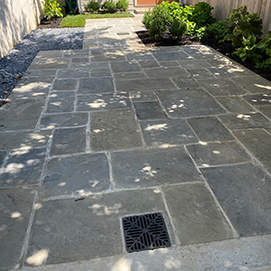 Project:Seeing the existing concrete slab as a benefit, rather than an obstacle, GreenSweep developed a design that preserved some portions of the concrete to lay natural Pennsylvania flagstone on top of, while demolishing other sections to create planting spaces. The design complements the existing straight lines and right angles of the space while still creating something wholly unique and multi-faceted. A small gravel area is the site for a future shed, a patch of turf in the sunniest corner gives the family dog a soft spot to lay on, and newly-planted hydrangeas and astilbe combine with existing rhododendrons (replanted from pots) to provide blooms and greenery around the natural stone patio. Finally, the patio itself is just large enough to accommodate the family car if needed, thus preserving an off-street parking space for future home resale value.