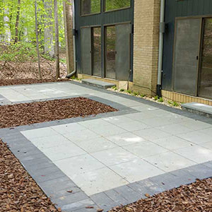 Project: GreenSweep used low-lying shrubs throughout the foundation planting beds to not impede the outdoor view through new large windows and sliding doors. The use of rock instead of mulch in the beds adds unique texture and assists with drainage. A two-tone Nicolock paver patio and adjacent play space with woodchips provide outdoor gathering areas for every member of the family. The installation of flagstone steppers from backyard to driveway improves overall backyard access.
